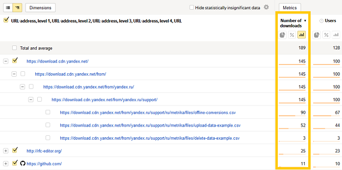 This report shows how many times users tried to download audio and video materials, archives, images, and other files from your site. Note that some of the downloads may have not been completed.