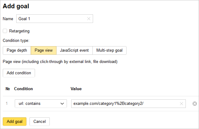 Specify part of a URL. Use this option if there are multiple target pages and they can be combined with a single condition. Specify as much of the URL as possible so the goal is only completed on the desired pages.