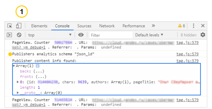- 2 — The marked up data that is passed to Yandex Metrica. If this information is missing in the console, check the marked up content. To do this, contact your webmaster.