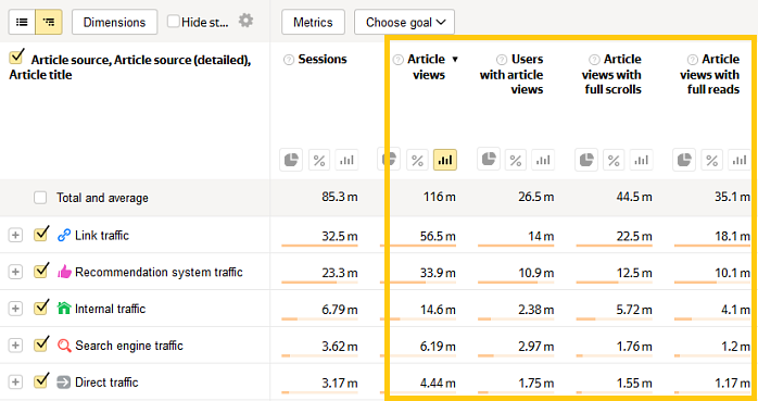 The site may contain not only articles, but also other sections, and it may be that not all articles are marked up. Therefore, the number of sessions in this report may also differ from other reports — it will include only those sessions in which pageviews of content were recorded.