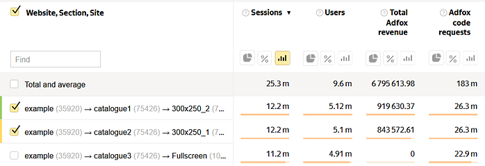 You can track the revenue that the site or a section of the site received from impressions of ads configured in Adfox, as well as the format of the ad unit. For convenience, sort “Total Adfox revenue” data in descending order.