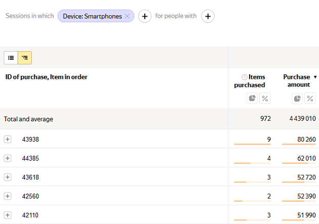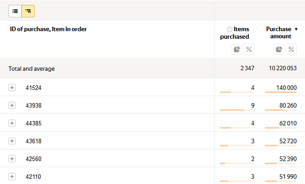 The data in the report is grouped by the purchase ID and shows every item included in the order. If you transfer data in multiple currencies, you can select one of them in the report. When you select a currency, monetary metric values are recalculated using the exchange rate from the day before the date of the transaction.
