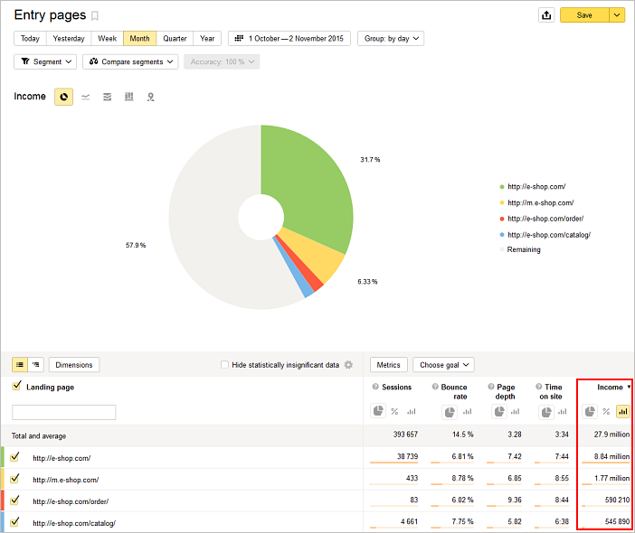 Metrics and the dimensions they are grouped in for E-commerce reports can be used in other Yandex Metrica reports. For example, you can determine which website pages were entry pages for sessions that brought the most revenue.