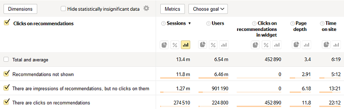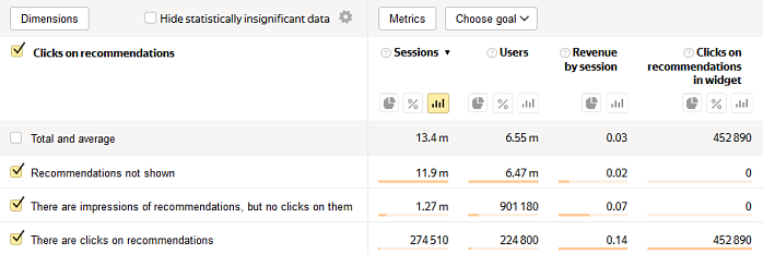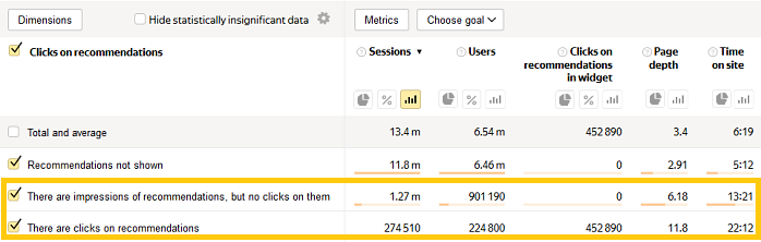 You can compare the revenue generated by site users who clicked through to recommended articles to the revenue generated by those who didn’t. You can do this by focusing on the Revenue by session metric.