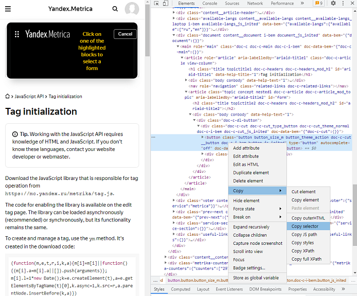 document.querySelector('xxxx').click();, wherexxxxis the value you copied. If everything is done correctly, the desired form is highlighted on the page.