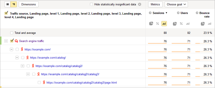 Para analizar los resultados en más detalle, haga clic en la línea Tráfico de motores de búsqueda. Esto abre un informe para el segmento creado.