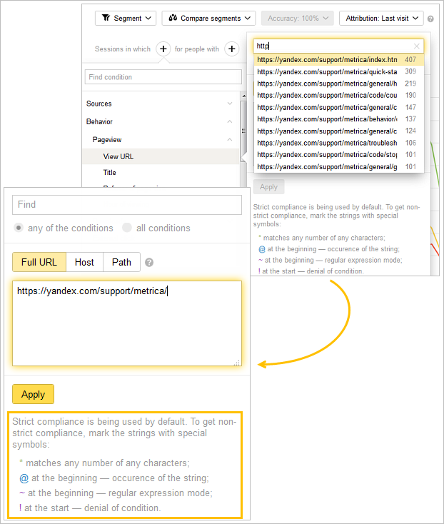 Cuando cambia de informe a informe, las condiciones de segmentación se guardan. Si las condiciones compatibles son diferentes, aparece un mensaje sobre su incompatibilidad en Yandex Metrica. En este caso, elimine las condiciones y establezca un nuevo segmento.