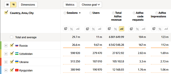 Si usa geotargeting publicitario en Adfox, el informe le ayuda a identificar qué regiones generan más ingresos, y también a tener en cuenta otras métricas.