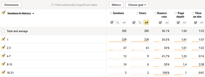 El informe admite todas las configuraciones disponibles en Yandex Metrica.