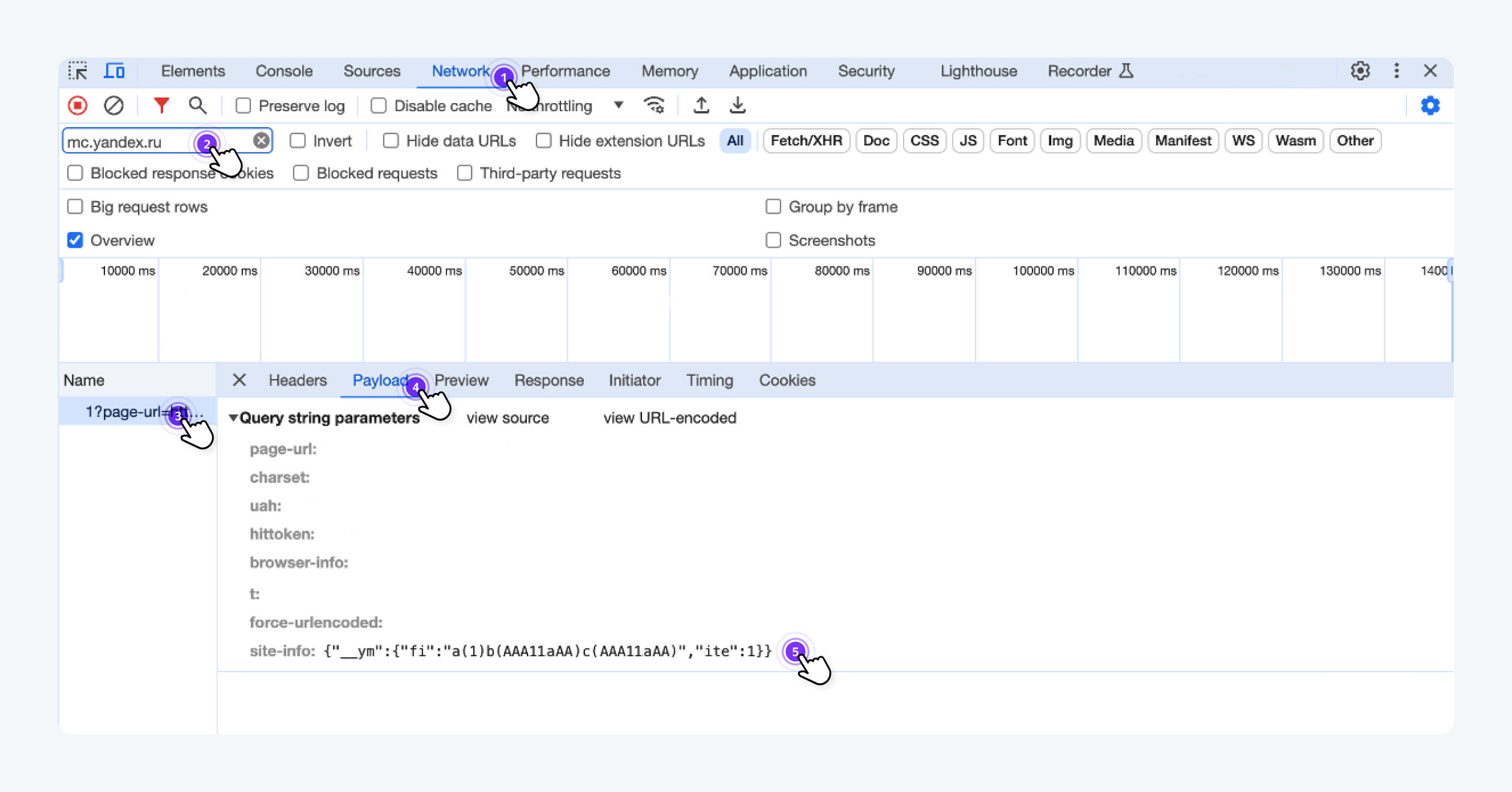 site-info: {“___ym”:{“fpp” …}estiver presente no conteúdo da aba, é porque você encontrou a solicitação correta e a transferência de dados está configurada corretamente. - Se esse parâmetro não estiver presente, abra outra solicitação que comece com