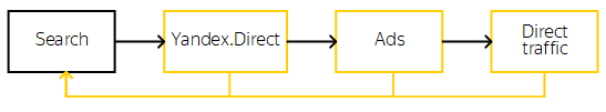 Caso tenha havido tráfego de outras origens após o clique num anúncio do Yandex Direct, todas as sessões são atribuídas ao último clique no anúncio do Yandex Direct.