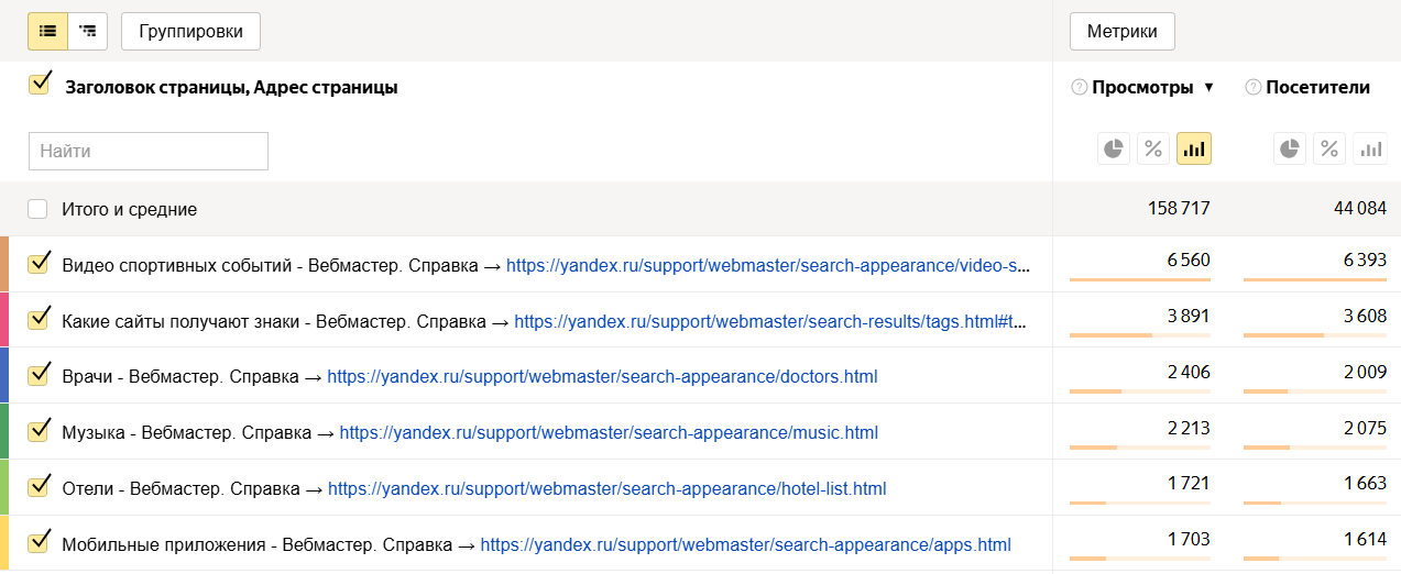 С помощью отчета вы можете узнать, какие страницы вашего сайта посещают чаще. Чтобы посмотреть заголовки страниц в соответствии с их адресами, добавьте группировку Адрес страницы и выберите способ отображения Линейный список.