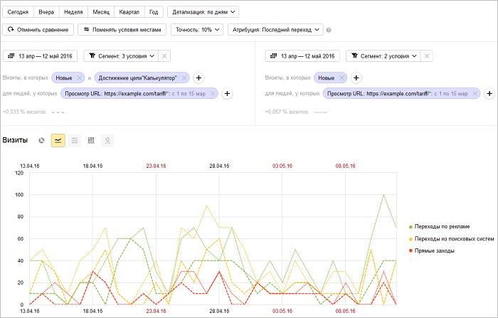 Чтобы оценить эффективность нового инструмента, необходимо сравнить статистику по посетителям, которые воспользовались калькулятором и тем, которые им не воспользовались (например, в первые 14 дней после запуска инструмента). Также будет полезно оценить источники посещений. Сделать это поможет сегментация. Предположим, что для счетчика уже создана цель — взаимодействие с калькулятором тарифов («Калькулятор»).