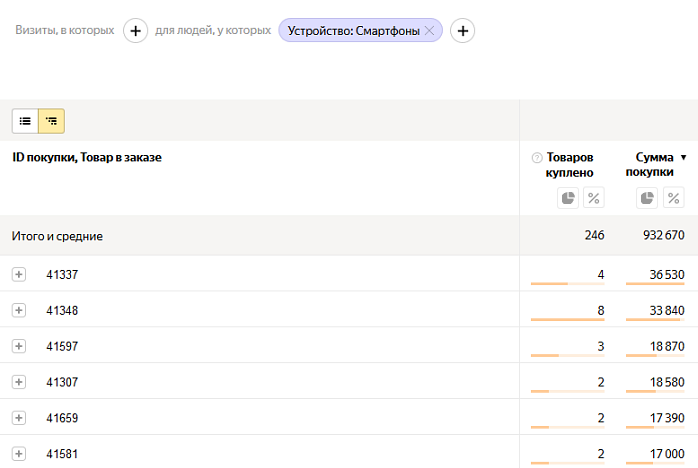 Данные в отчете сгруппированы по идентификатору покупки с детализацией до товара в заказе. Если вы передаете данные в разной валюте, в отчете вы можете выбрать одну из них. При выборе валюты значения денежных метрик пересчитываются в соответствии с курсом конвертации, который был днем ранее совершения дохода.