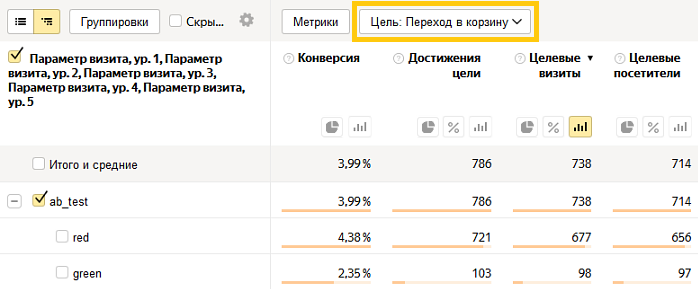 Например, вы можете посмотреть, как цвет кнопки Купить влияет на конверсию по ранее созданной цели «Переход в корзину». Для этого: