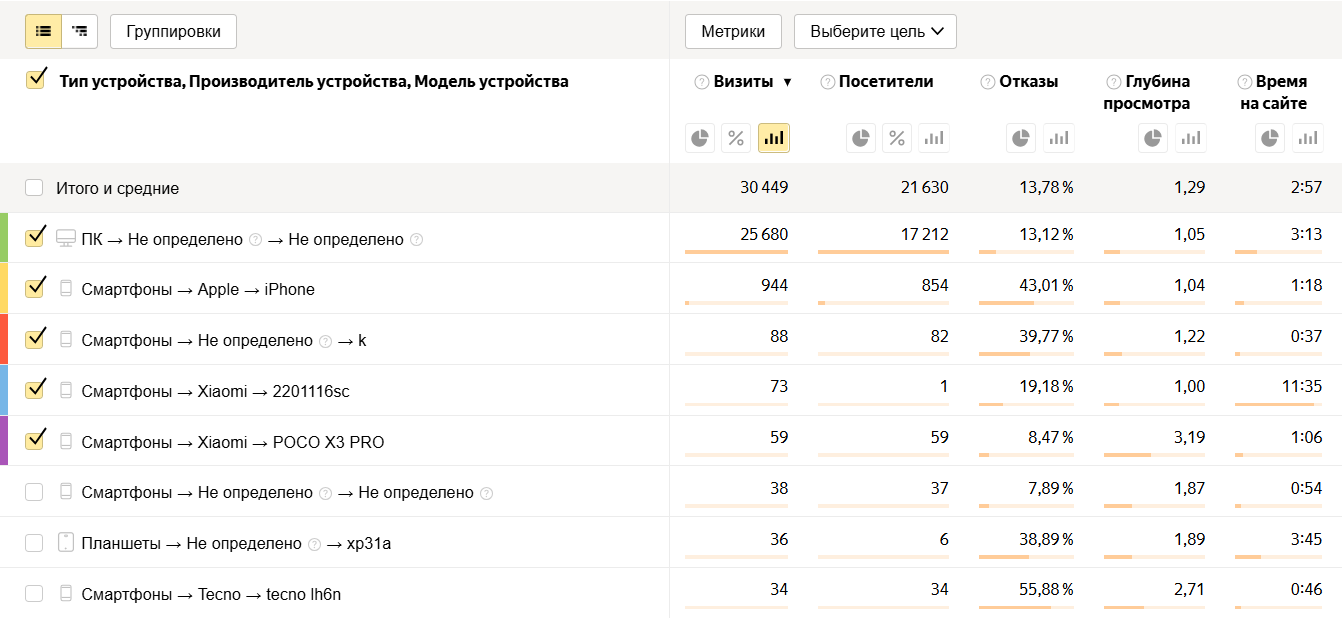 Отчет содержит статистику по моделям устройств, которые используют посетители.