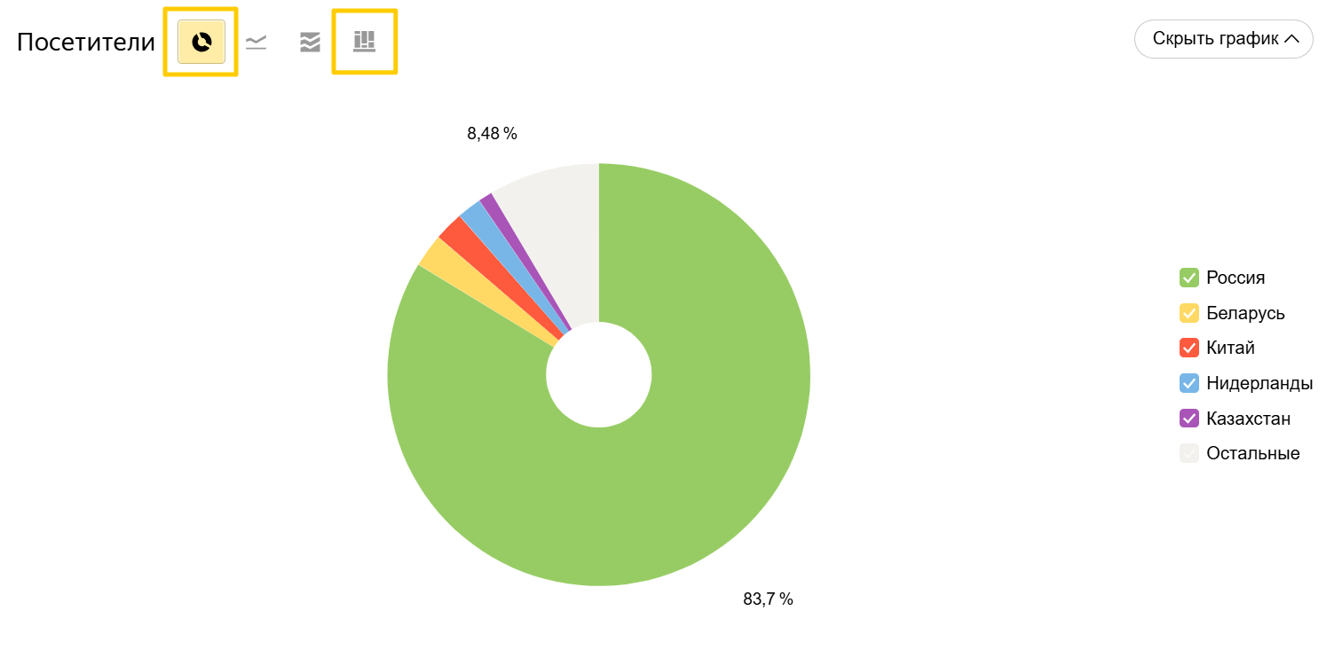 Отчет покажет общее распределение посетителей сайта по регионам.