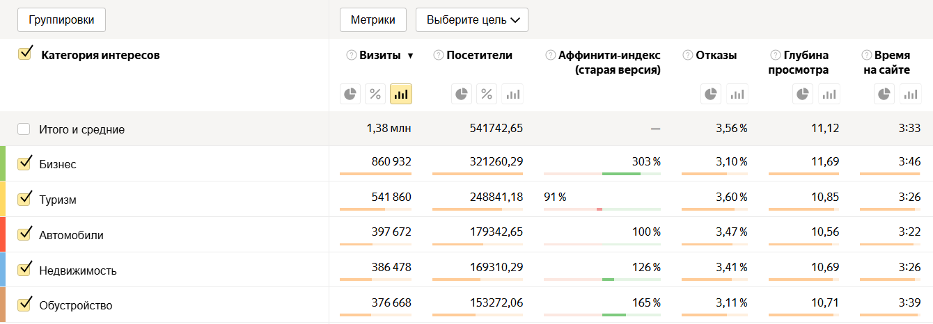 Сопоставив аффинити-индекс с другими показателями отчета (визитами, отказами, конверсией), вы можете определить предпочтения посетителей, которые конвертируются лучше всего.
