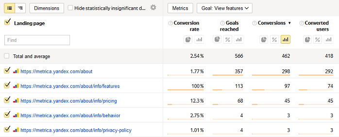 Rapor, Yandex Metrica'da kullanılabilen tüm ayarları destekler.
