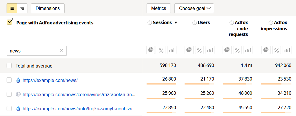news, böylece haberlerle bir rapor oluşturabilirsiniz. - “Adfox Toplam Geliri” ne göre verileri azalan sırada sıralayın – listenin başında en fazla geliri getiren sayfalar görüntülenecektir.