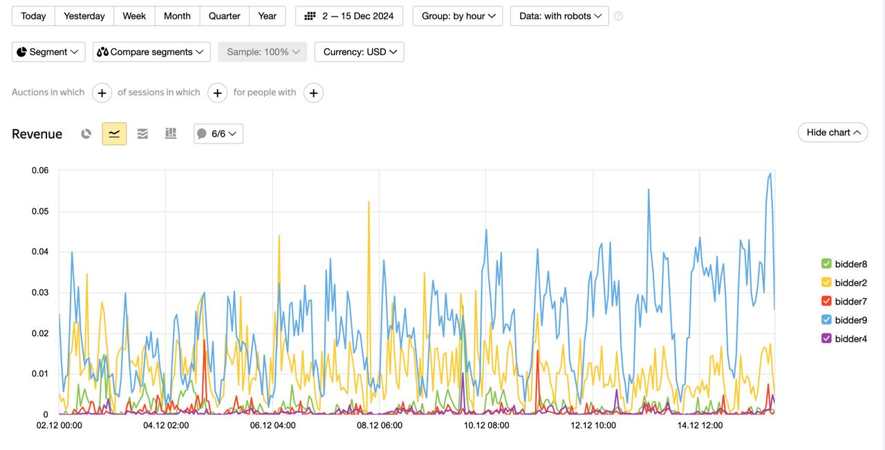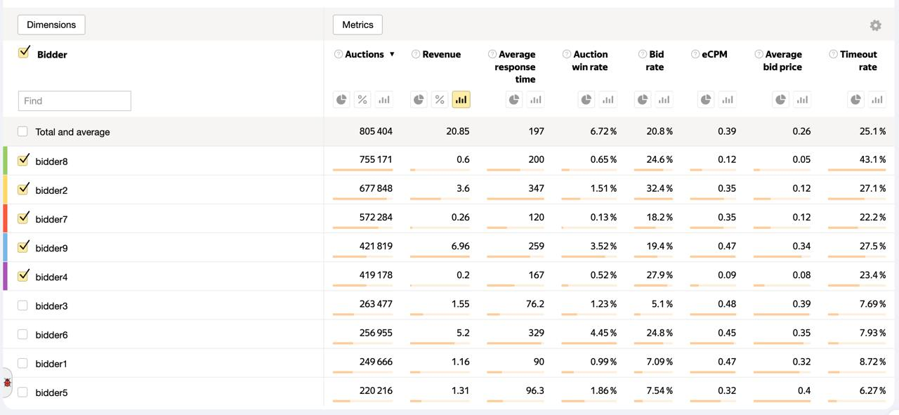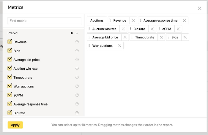 - Prebid.js ayarlarında Yandex Analytics Adapter'ı başlatın. Yandex Metrica veri almaya başlar; ardından rapor ayarlarını yapabilirsiniz.