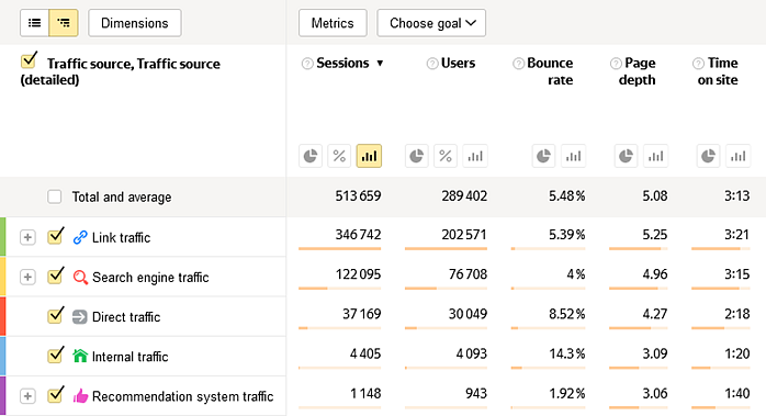 Siteye yapılan her ziyaretin kendi kaynağı vardır. Yandex Metrica tüm kaynakları birkaç grupta toplar. Ayrıntılı bilgi için Yandex Metrica Trafik Kaynağını Nasıl Belirler bölümüne bakın.