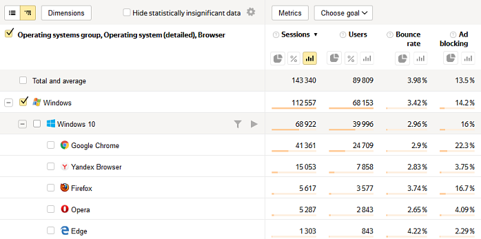 - Gruplamayı Gruplamalar → Teknolojiler → Tarayıcı ve metriği Metrikler → Teknolojiler → Reklam Engelleme ekleyin.