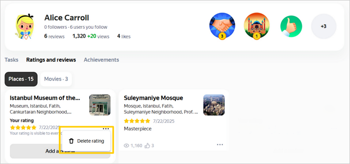 On the Ratings and reviews tab, find the organization, game, or movie that you rated.