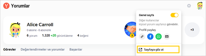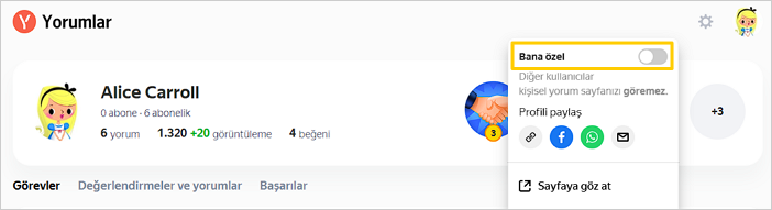 Varsayılan olarak sayfanız herkese açıktır, tüm kullanıcılar bilgilerinizi, değerlendirmelerinizi ve yorumlarınızı görebilir. Herkese açık sayfanızı gizlerseniz, diğer kullanıcılar tarafından erişilemez hale gelir, ancak incelemelerinizde adınız ve avatarınız gösterilmeye devam eder.