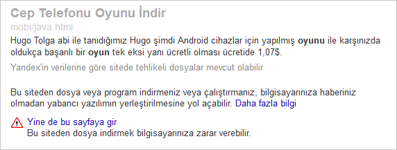 Kötü amaçlı yazılım barındırdığı saptanan web sayfaları aynı zamanda benzersiz yararlı ve sorgunuza uygun bilgiler içerebildiğinden Yandex bunları arama sonuçlarından kaldırmaz.