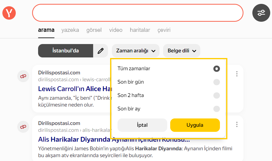 Gelişmiş arama filtreleri yardımıyla ekleme tarihine göre site ve belgeler arayabilirsiniz.