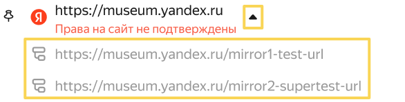 Yandex Webmaster, bir sitenin ana adresini ve ikincil ayna sitesi gruplarını. Bir sitenin ikincil aynasını eklerseniz, site listesi ana adresi ve yönetim haklarınızı doğrulamanız gerektiğini belirten bir mesaj gösterecektir.