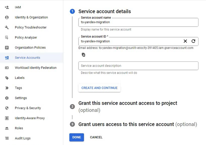 Grant this service account access to project adımını atlayın veya proje erişim yetkilerini ayarlayın.