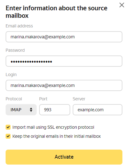 Yandex'teki e-posta hesabından e-postaları başka bir servisin e-posta kutusuna toplamak istiyorsanız imap.yandex.ru sunucudan İMAP protokolüne göre e-posta istemcilerini kullanarak e-posta kutusuna erişimi etkinleştirin (ayrıntılı bilgi burada).