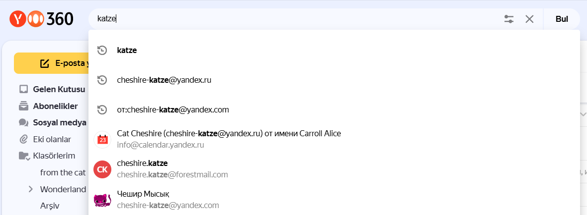Aramada, eklenen dosyanın adını ya da eklenen belge metnini belirtirseniz Yandex Mail bu iletileri de bulacaktır.