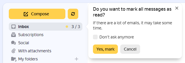 Yandex Mail, sosyal ağlardan, ayrı klasörlere abonelikleri ve sosyal medya bildirimlerini toplayabilir. Ek içeren tüm e-postalar özel sistem klasöründe de görüntülenebilir. Ayrıntılı bilgi için Klasörler yazısını okuyun.