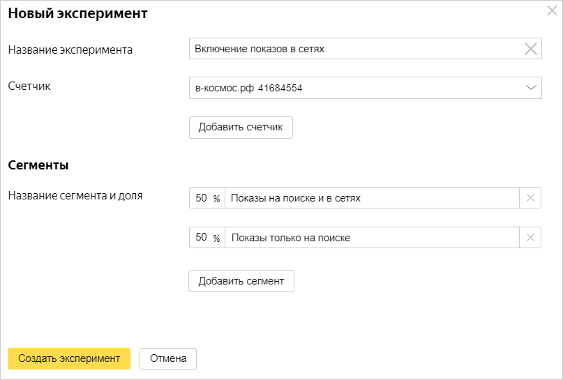 В созданном эксперименте невозможно удалить сегмент или добавить новый. Удалить можно только эксперимент, который не используется в кампании в Яндекс Директе.