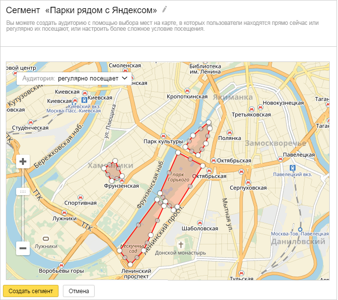 Аудитория: регулярно посещает, живет или работает — в сегмент попадут анонимные идентификаторы пользователей, которые регулярно бывают, живут или работают на выбранной территории. При подборе учитываются данные за последние 45 дней. Объявления будут показаны пользователям, попавшим в сегмент, вне зависимости от их местоположения.