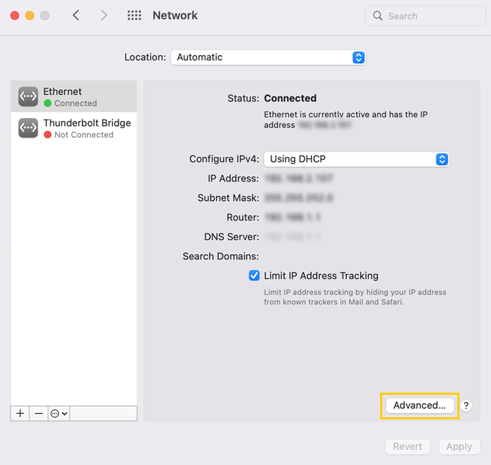 Select the network which you want to configure Yandex DNS for, then click Advanced.