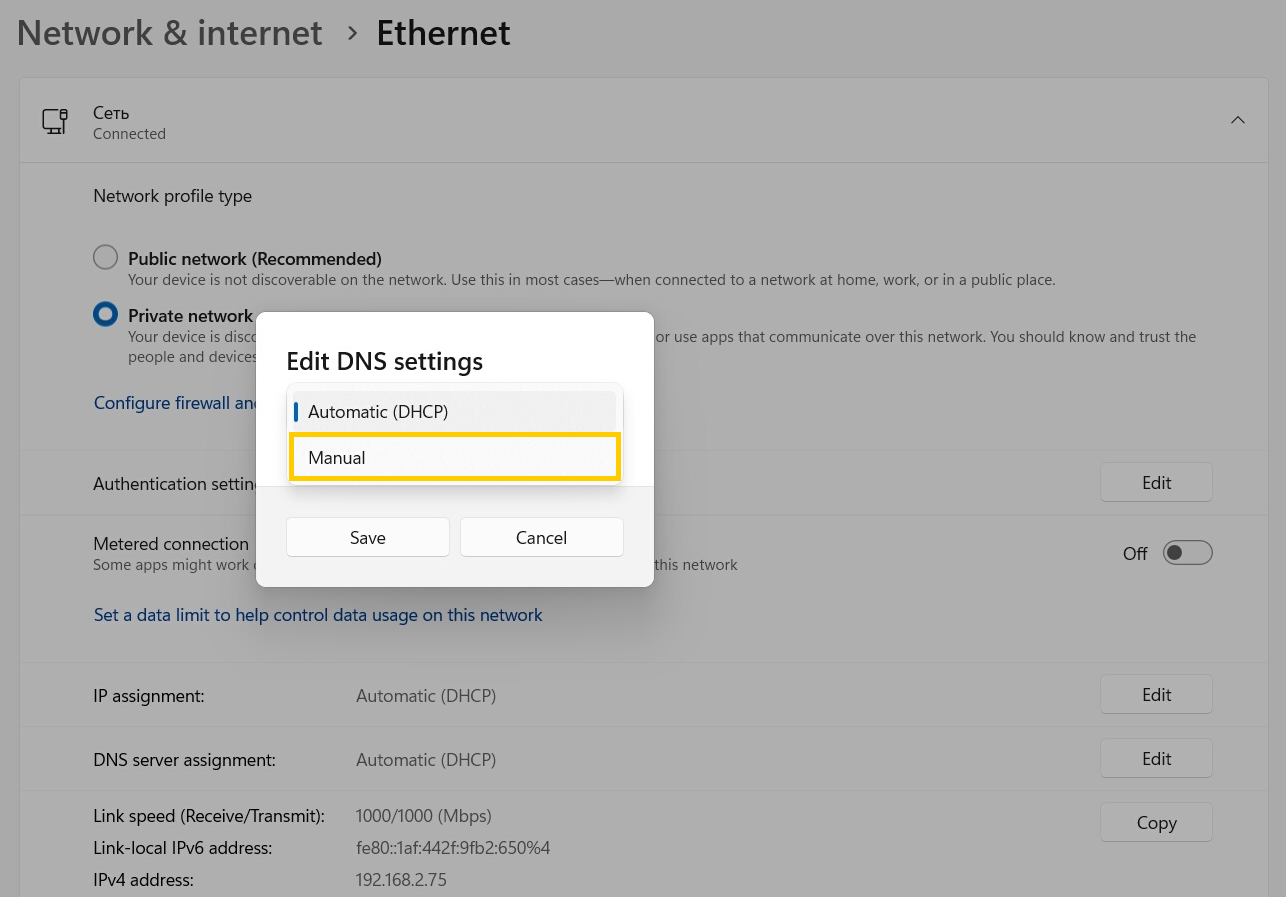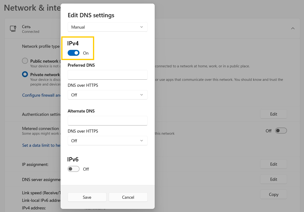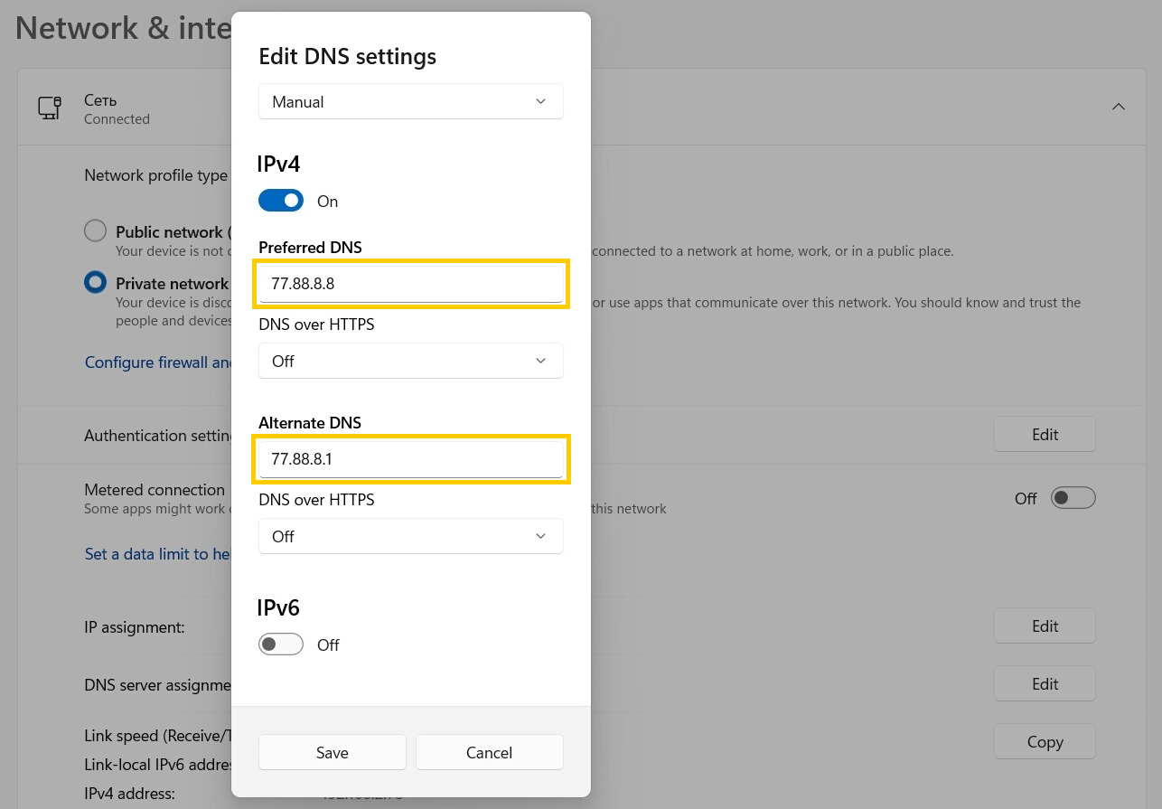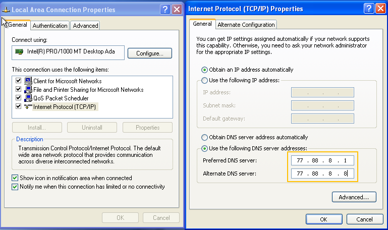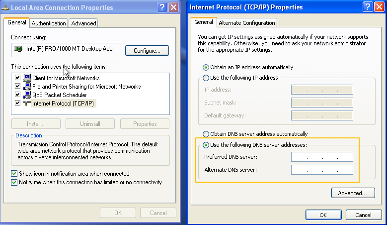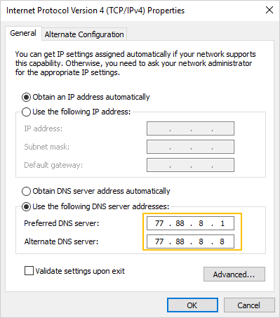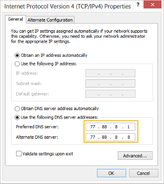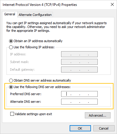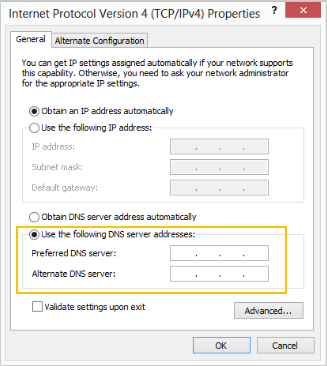 Enter IP addresses of selected DNS servers in the Preferred DNS server and Alternate DNS Server fields.