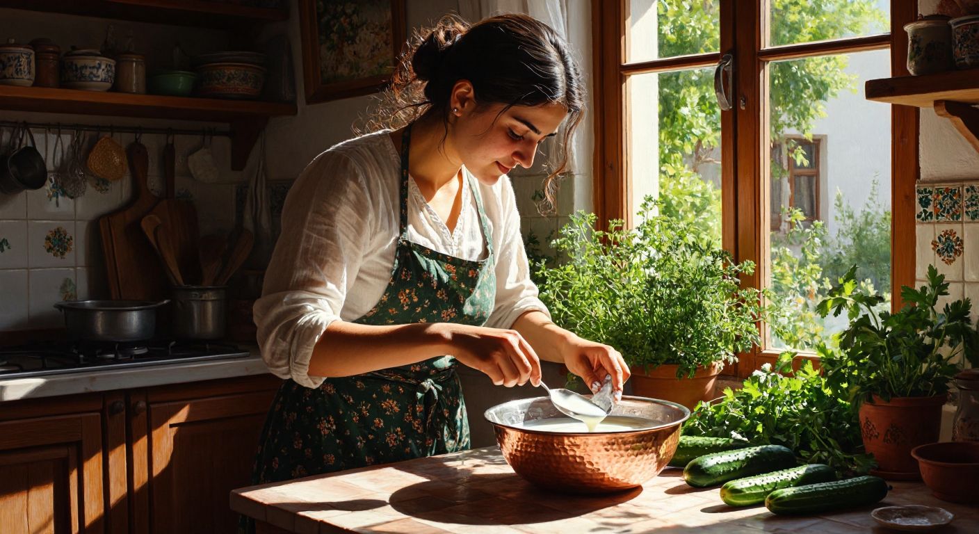 A Turkish woman in a sunlit kitchen vigorously stirs yogurt and water in a copper bowl, with fresh herbs and cucumbers nearby, her expression focused yet content.
